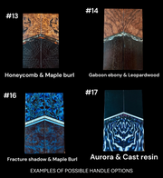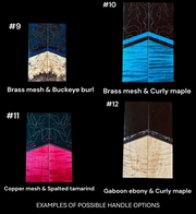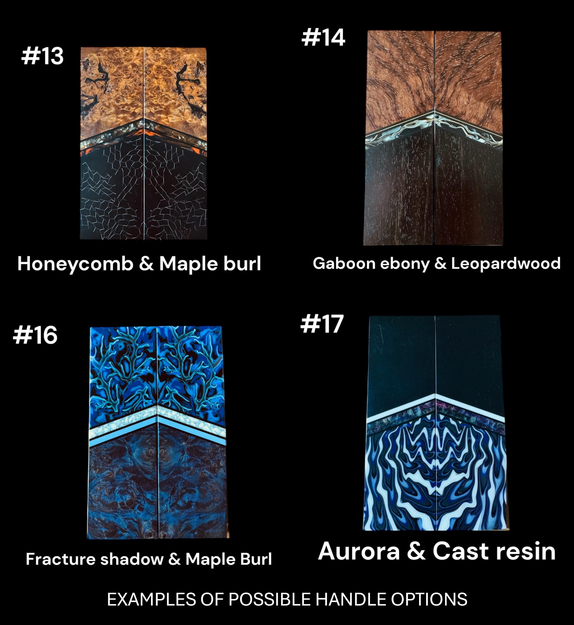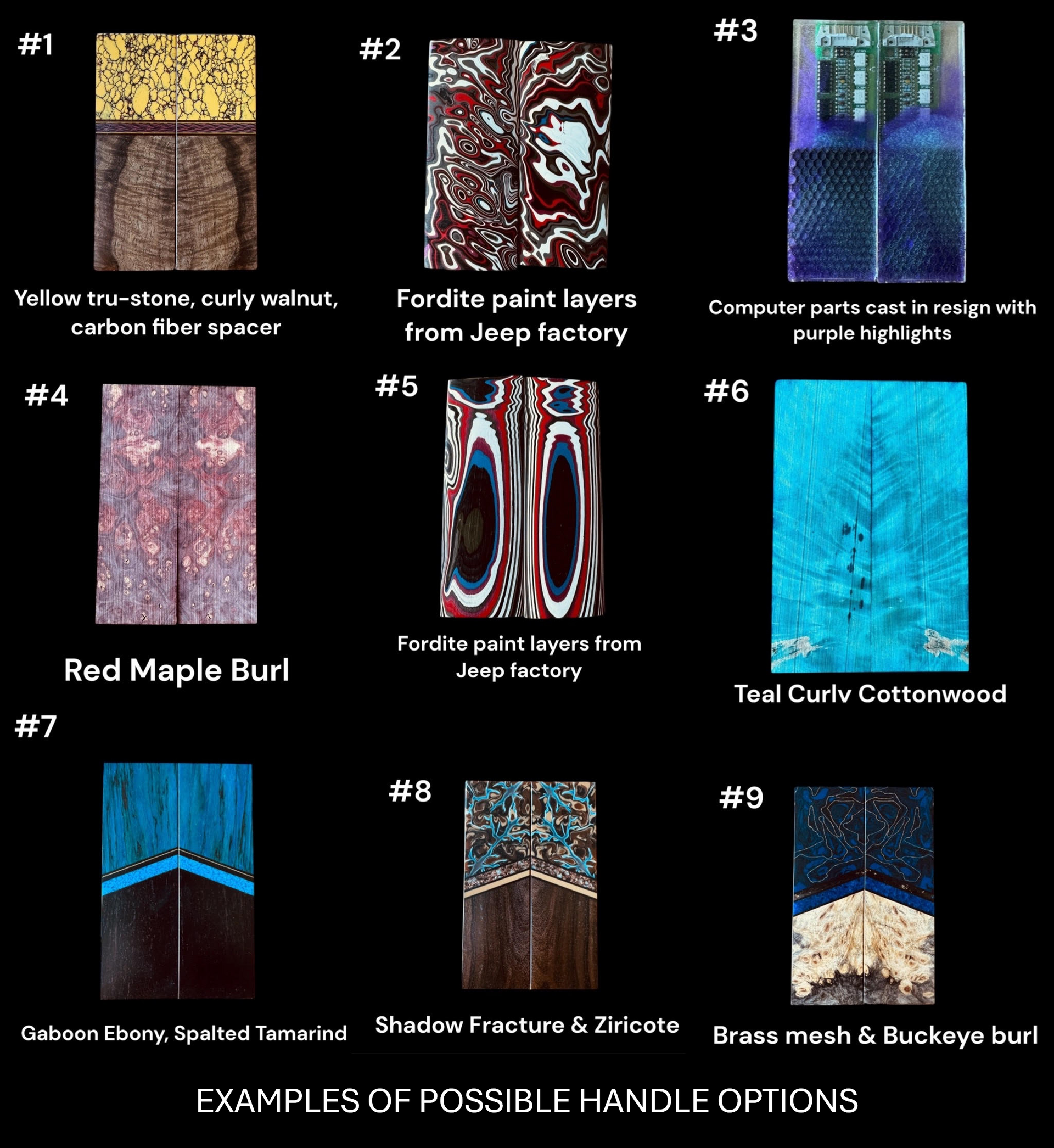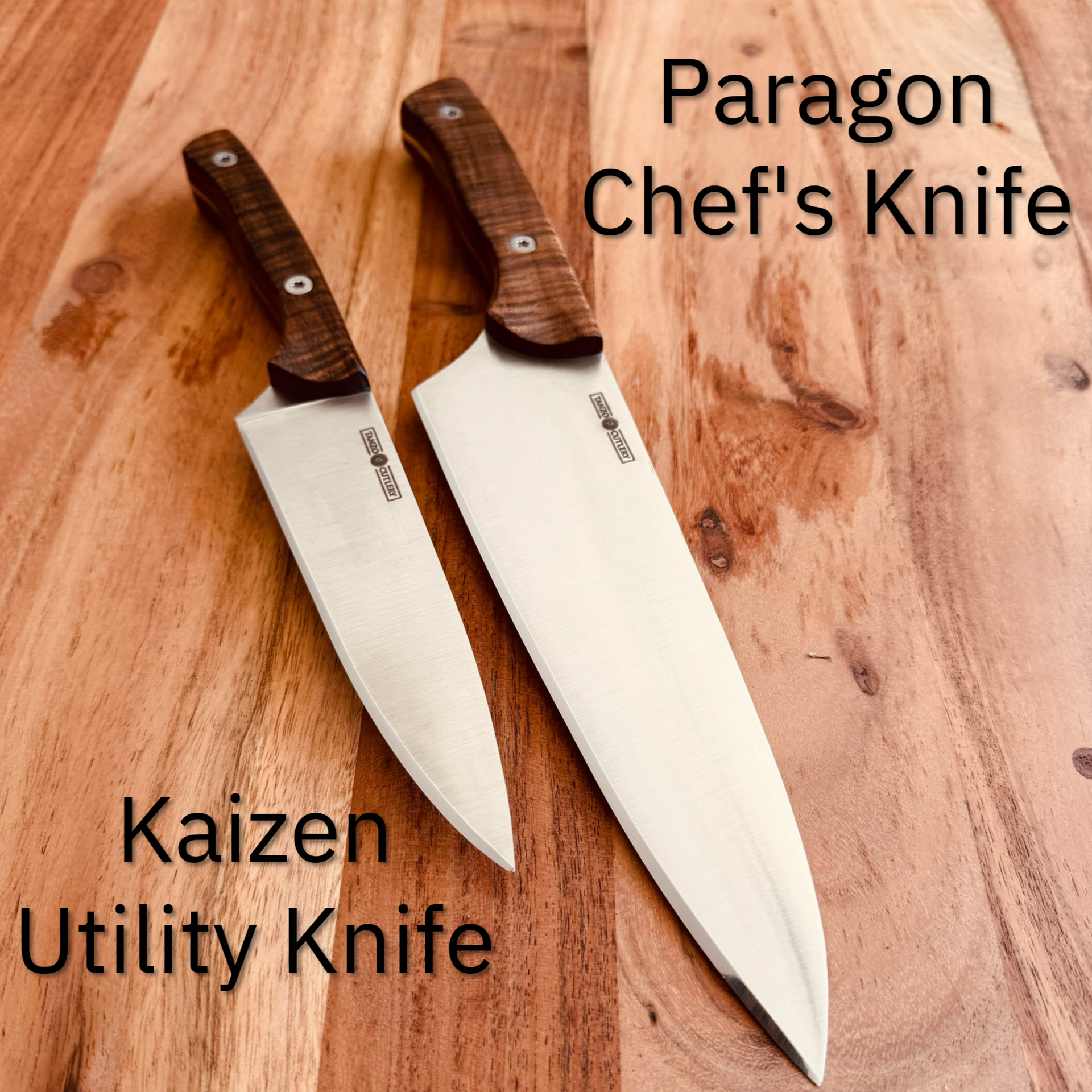 3. Custom Design: Choose from our offerings, like the versatile 8 inch Paragon Chef's Knife or the precise 6.25 inch Kaizen Utility Knife. You can customize blade length, handle materials, colors, and pin styles. See the provided images or view our past work in the gallery.