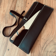 All custom knives are made with AEB-L high quality Swedish Stainless Steel with a blade thickness of 1/8 inch. Included with each knife is a handmade leather case with securing strap and lifetime resharpening to protect your investment.
